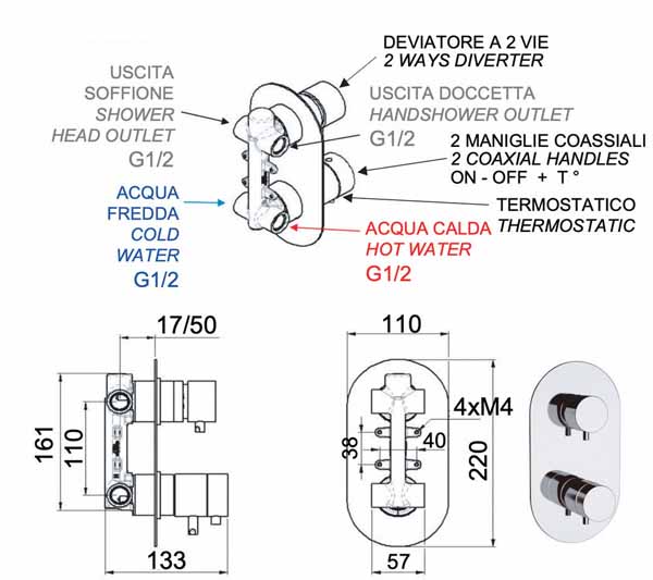Смеситель встраиваемый Remer Elegance NT92 термостатический - это термостатический смеситель, предназначенный для комфортного использования в душе и ванне, который позволяет заранее выбрать температуру воды и поддерживать ее постоянной в течение всего времени использования. Горячая и холодная вода смешиваются до нужной температуры уже внутри термостатического картриджа, таким образом, можно наслаждаться расслабляющим душем, избегая как ожогов, так и резких перепадов температуры, вызванных внезапным открытием других кранов. Смеситель изготовлен из высококачественной латуни. Качественное покрытие устойчиво к царапинам.