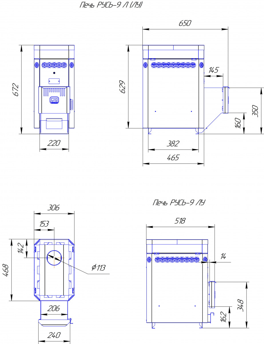 Выход дымовой трубы смещен от края к центру каменки (кроме Русь-9Л), что значительно упрощает монтаж дымохода.